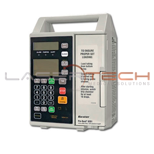 La bomba de infusión volumétrica de un solo canal Flo-Gard @ 6201 es una bomba electromecánica utilizada para la infusión intravenosa de líquidos a velocidades seleccionadas por el usuario. La bomba contiene una cabeza de bomba peristáltica lineal que es programable y permite la infusión de programas de medicación primaria y secundaria. El programa secundario cambia automáticamente al programa primario cuando se completa la infusión secundaria (autosupervisión automática).