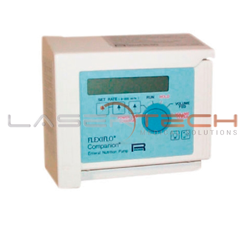 The Ross Flexiflo Companion is a 2-piece unit, consisting of a pump and an independent charger unit into which the pump can be inserted. The pump can be used as a stationary unit mounted on a pole, using the pole clamp on the loader, or it can function as an ambulatory pump using the optional Transporter bag. The pump uses a dedicated cassette with a bellows mechanism to deliver measured quantities of enteral formula. LCD screen, touch input and control of rotary functions. There is no dose limit. Ross does not recommend this product for neonatal or pediatric use.